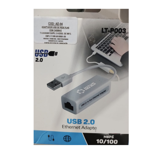 - Converta uma porta USB do seu computador ou notebook em uma porta RJ45 disponibilizando uma conexão de rede Ethernet com ótimo desempenho e velocidade. - Compatível com USB 1.0, 1.1, 2.0. COMO INSTALAR: - Conecte o adaptador na entrada USB do PC ou Notebook. - Instale o Driver e reinicie o Windows. - Ligue o cabo da internet na saída RJ45 do Adaptador. - Pronto, agora você pode navegar na internet. COMPATIBILIDADE: - Windows 98ME - Windows XP - Windows Vista - Windows 7 - Windows 8 - Windows 10 - IEEE 802.3 (10Based-T) e (100Based-TX)802.3U - Suporta as operações full-duplex e half-duplex INFORMAÇÕES TÉCNICAS: - Cor: Branco. - Conector: USB 1.0, 1.1, 2.0 - Saída: RJ45. DIMENSÕES (LxAxC): 12x17x3 CONTEUDO DA EMBALAGEM: 1x Cabo Adaptador USB 2.0 para RJ45